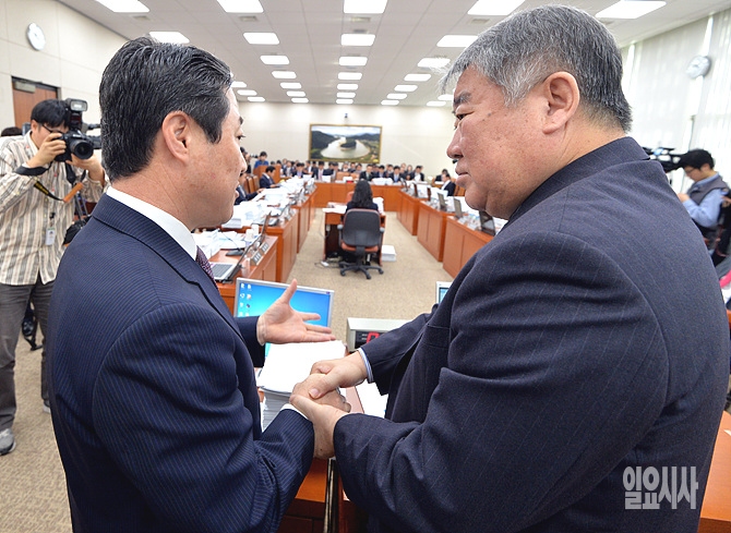 19일, 서울 여의도 국회 농림축산해양식품수산위원회 회의실에서 김우남 위원장(사진 오른쪽)과 유기준 외교통상위원장이 정회 직전, 악수를 나누며 이야기를 나누고 있다.