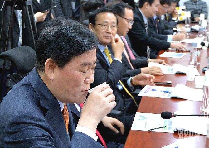 19일, 최경환 부총리가 서울 여의도 국회 의원회관에서 친박 국가경쟁력강화포럼 주최로 '최경환 기획재정부 장관 겸 부총리 초청 강연회' 도중 목이 타는 듯 물을 들이키고 있다.
