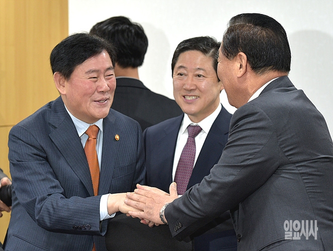 19일, 최경환 부총리 겸 기획재정부장관(사진 왼쪽)이 서울 여의도 국회 의원회관에서 친박 국가경쟁력강화포럼 주최로 '최경환 기획재정부 장관 겸 부총리 초청 강연회'가 열린 가운데 강연회 직전, 서청원 의원과 최 부총리가 악수를 나누고 있다.