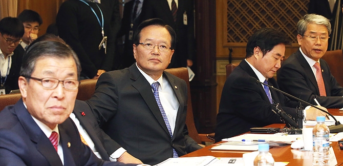 정의화 국회의장(사진 왼쪽서 두 번째), 황진하 국회 국방위원장(사진 왼쪽) 등이 19일, 서울 여의도 국회에서 열린 제2차 의장 주재 위원장단 연석회의에 참석해 있다.