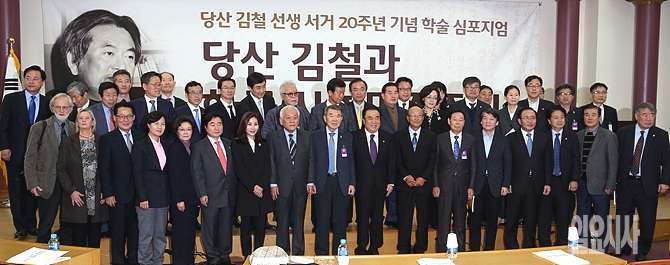 당산 김철 선생의 20주기를 맞아 20일, 서울 여의도 국회 의원회관 제1소회의실에서 그의 생애와 사상을 재조명하는 학술 심포지엄이 개최된 가운데, 참석자들이 기념촬영을 하고 있다.