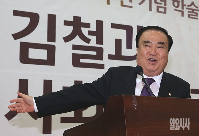 당산 김철 선생의 20주기를 맞아 20일, 서울 여의도 국회 의원회관 제1소회의실에서 그의 생애와 사상을 재조명하는 학술 심포지엄이 개최된 가운데, 문희상 새정치민주연합 비상대책위원장이 축사를 하고 있다.