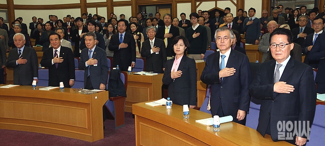 당산 김철 선생의 20주기를 맞아 20일, 서울 여의도 국회 의원회관 제1소회의실에서 그의 생애와 사상을 재조명하는 학술 심포지엄이 개최된 가운데, 참석자들이 국민의례를 하고 있다.