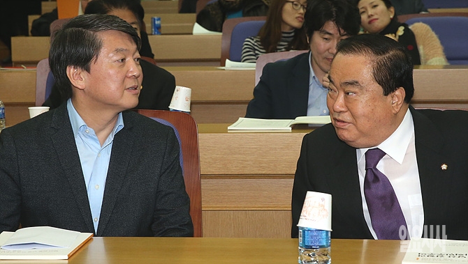 당산 김철 선생의 20주기를 맞아 20일, 서울 여의도 국회 의원회관 제1소회의실에서 그의 생애와 사상을 재조명하는 학술 심포지엄이 개최된 가운데, 문희상 새정치민주연합 비대위원장과 안철수 전 공동대표가 이야기를 나누고 있다.