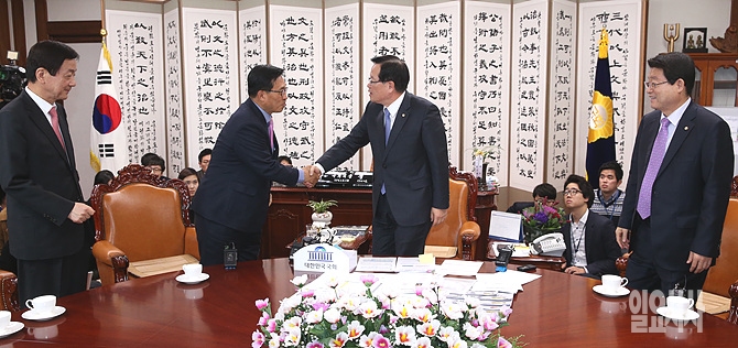24일 오후, 서울 여의도 국회 의장접견실에서 열린 예산안부수법안 관련 상임위원단 회동 직전, 정의화 국회의장이 김춘진 보건복지위원장과 악수를 나누고 있다.