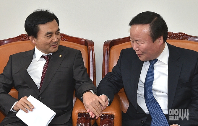 김재원 새누리당(사진 오른쪽)·안규백 새정치민주연합 원내수석부대표가 24일 오후, 서울 여의도 국회 새누리당 원내수석대표실에서 '누리과정' 예산을 논의하기 위해 회동을 갖고 있다.
