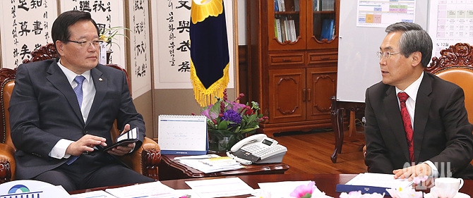 정의화 국회의장과 새정치민주연합 우윤근 원내대표가 24일 오후, 서울 여의도 국회 의장 접견실에서 예산안과 관련해 회동을 갖고 있다.