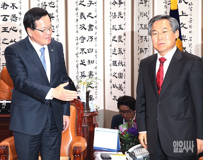 정의화 국회의장(사진 왼쪽)과 새정치민주연합 우윤근 원내대표가 24일 오후, 서울 여의도 국회 의장 접견실에서 예산안과 관련해 회동을 갖고 있다.