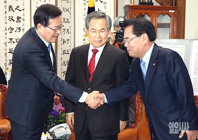 정의화 국회의장(사진 왼쪽)과 새정치민주연합 우윤근 원내대표(사진 가운데)가 24일 오후, 서울 여의도 국회 의장 접견실에서 예산안과 관련해 회동 직전, 백재현 새정치민주연합 정책위의장과 악수를 나누고 있다.