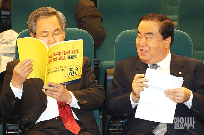 24일 오후, 서울 여의도 국회도서관 대강당에서 '지방복지재정의 위기, 분석과 해법 토론회'가 열린 가운데, 새정치민주연합 문희상 비대위원장, 우윤근 원내대표가 참석해 이야기를 나누고 있다.