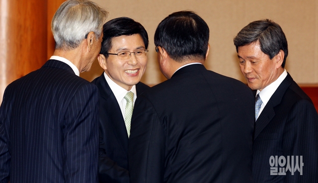 통합진보당 해산 심판 사건 최종 변론일인 25일 서울 종로구 재동 헌법재판소 대심판정에서 황교안 법무부 장관이 변호인들과 대화하고 있다.