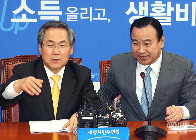 25일 오전, 서울 여의도 국회 새정치민주연합 대표실에서 새누리당 이완구·새정치민주연합 우윤근 원내대표가 여야 주례회동을 갖고 있다.