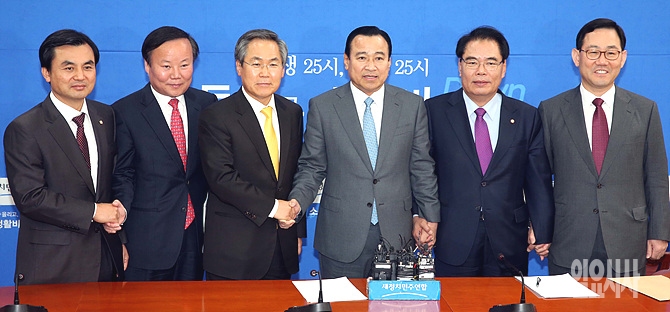 25일 오전, 서울 여의도 국회 새정치민주연합 대표실에서 새누리당 이완구(사진 오른쪽서 세 번째)·새정치민주연합 우윤근 원내대표(사진 왼쪽서 세 번째), 김재원(사진 왼쪽서 두 번째)·안규백 원내수석부대표(사진 왼쪽), 주호영(사진 오른쪽서 첫 번째)·백재현 정책위의장이 여야 주례회동 직전, 손을 맞잡고 기념촬영을 하고 있다.