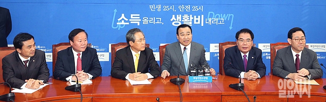 25일 오전, 서울 여의도 국회 새정치민주연합 당대표실에서 새누리당 이완구·새정치민주연합 우윤근 원내대표 등 여야 지도부가 주례회동을 갖고 있다.