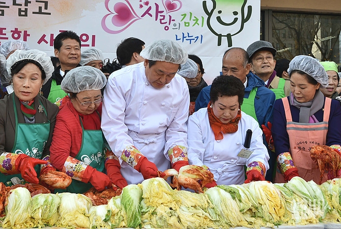 새누리당 김무성 대표(사진 가운데)가 25일, 서울 여의도 국회 후생관 앞에서 한국근우회 주최 사랑의 김치 나누기 행사에 참석해 자원 봉사자들의 김장을 돕고 있다.