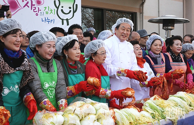 새누리당 김무성 대표가 25일, 서울 여의도 국회 후생관 앞에서 한국근우회 주최 사랑의 김치 나누기 행사에 참석해 자원봉사자들과 함께 김장을 담그며 웃음 짓고 있다.