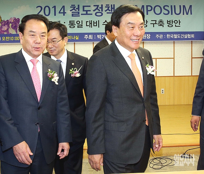 25일 오전, 서울 여의도 국회 제3세미나실에서 '통일 대비 수도권 철도망 구축 방안'을 주제로 2014 철도정책 심포지엄(주최 박기춘 국회 국토교통위원장)이 열린 가운데, 박 위원장이 세미나실로 입장하고 있다.