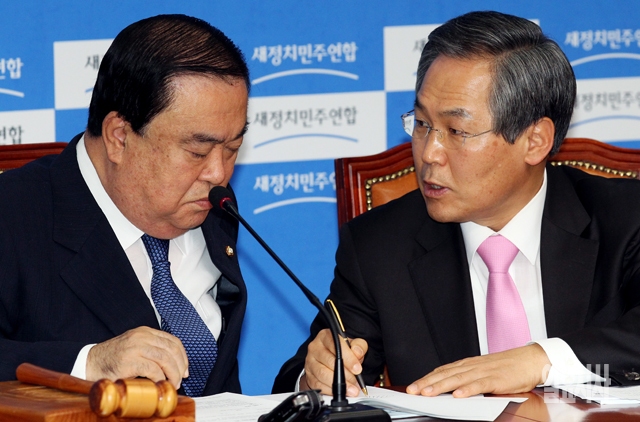 새정치민주연합 문희상 비대위원장(왼쪽)과 우윤근 원내대표가 26일 서울 여의도 국회에서 열린 비상대책위원회의에서 대화하고 있다.