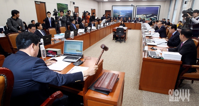 26일 새정치민주연합이 누리과정 예산 심사 파행과 관련해 모든 상임위 법안심사를 잠정 보류한 가운데 이날 국회에서 열린 국토교통위원회 전체회의에서 박기춘 위원장이 개의 선언을 하고 있다.