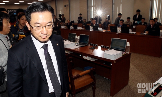 26일 새정치민주연합이 누리과정 예산 심사 파행과 관련해 모든 상임위 법안심사를 잠정 보류한 가운데 이날 국회에서 열린 국토교통위원회 전체회의에서 정성호 새정치민주연합 간사가 퇴장하고 있다.