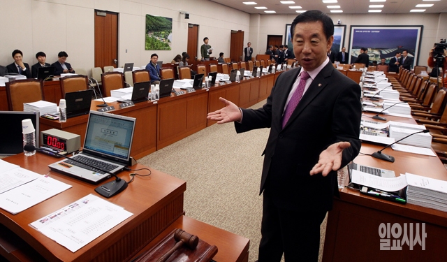 26일 새정치민주연합이 누리과정 예산 심사 파행과 관련해 모든 상임위 법안심사를 잠정 보류한 가운데 이날 국회에서 열린 국토교통위원회 전체회의에서 빈 회의장을 보며 김성태 새누리당 간사가 서 있다.