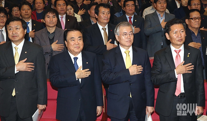 26일 오후, 서울 여의도 국회 의원회관서 열린 수도권 서부지역 광역철도건설사업 정기보고회 직전,새정치민주연합 문희상 비상대책위원장(사진 왼쪽서 두 번째), 신기남·문재인(사진 오른쪽서 두 번째)·정청래 의원 등이 국기에 대한 경례를 하고 있다.