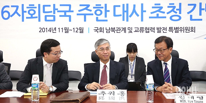 원혜영 국회 남북관계 및 교류협력 발전 특별위원회 위원장이 26일 오후 서울 여의도 국회 의원회관에서 열린 '6자회담국 주한대사 초청 간담회'에서 추궈홍 중국대사와 대화를 나누고 있다.