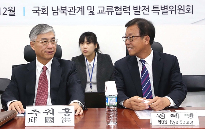 원혜영 국회 남북관계 및 교류협력 발전 특별위원회 위원장(사진 오른쪽)이 26일 오후 서울 여의도 국회 의원회관에서 열린 '6자회담국 주한대사 초청 간담회'에서 추궈홍 중국대사와 대화를 나누고 있다.