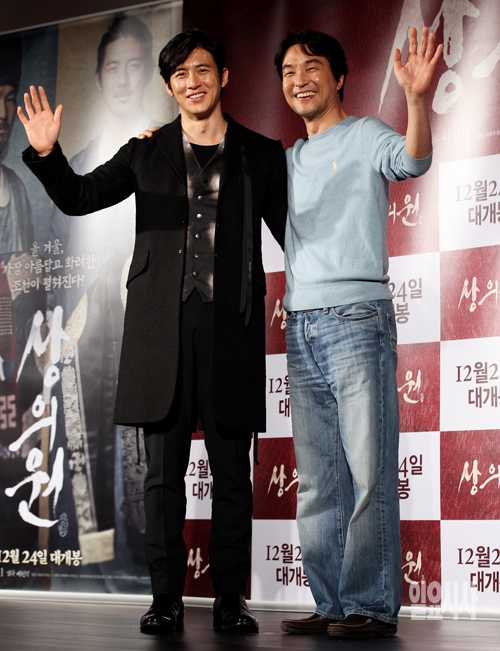 배우 한석규(오른쪽)와 고수가 26일 서울 메가박스 동대문점에서 열린 영화 <상의원>(감독 이원석) 제작보고회에서 포토타임을 갖고 있다.