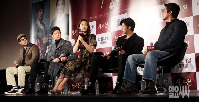 26일 서울 메가박스 동대문점에서 열린 영화 <상의원> 제작보고회에서 감독과 출연배우들이 간담회를 갖고 있다. 왼쪽부터 감독 이원석, 배우 유연석, 박신혜, 고수, 한석규.