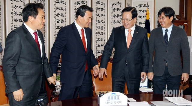 정의화 국회의장이 27일 서울 여의도 국회 의장실에서 예산결산특별위원회 홍문표 위원장과 여야 간사인 이학재 새누리당 의원, 이춘석 새정치민주연합 의원과 회동을 갖고 있다. 왼쪽부터 이학재 의원, 홍문표 위원장, 정의화 의장, 이춘석 의원.