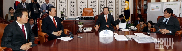 정의화 국회의장이 27일 서울 여의도 국회 의장실에서 예산결산특별위원회 홍문표 위원장과 여야 간사인 이학재 새누리당 의원, 이춘석 새정치민주연합 의원과 회동을 갖고 있다. 왼쪽부터 이학재 의원, 홍문표 위원장, 정의화 의장, 이춘석 의원.