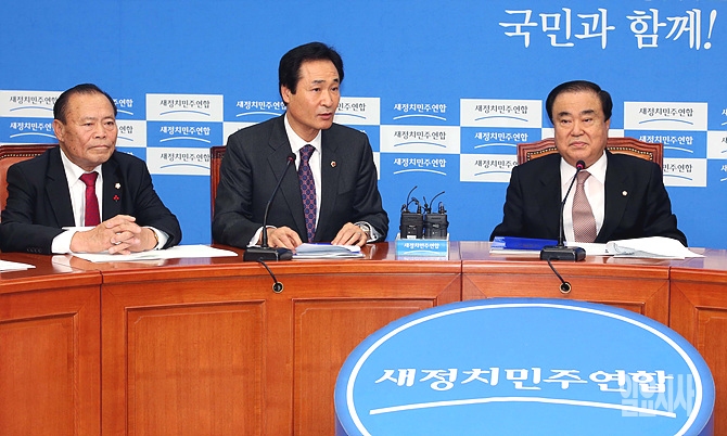 새정치민주연합 문희상 비상대책위원장(사진 오른쪽)이 27일, 서울 여의도 국회 당대표 회의실에서 열린 '전국 시·도의회의장협의회 간담회'에 참석해 있다.