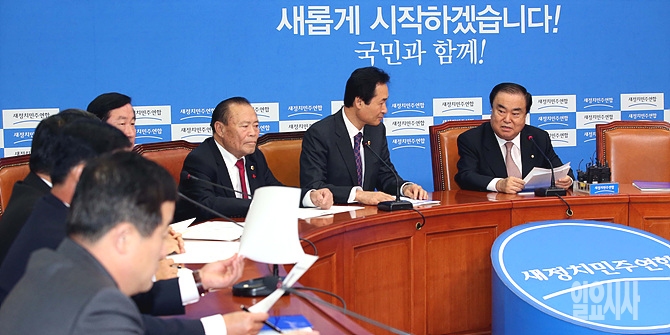새정치민주연합 문희상 비상대책위원장(사진 오른쪽)이 27일, 서울 여의도 국회 당대표 회의실에서 열린 '전국 시·도의회의장협의회 간담회'에서 발언하고 있다.