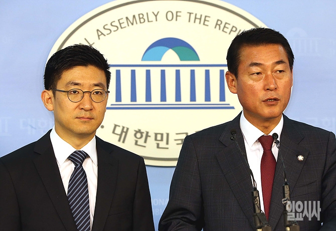 새누리당 황영철(사진 오른쪽), 김세연 의원이 27일 오후 서울 여의도 국회 정론관에서 "국회선진화법의 합의정신을 살려 예산안 법정심사 기한을 준수하자"며 기자회견을 하고 있다.