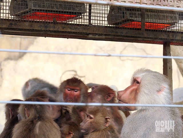 27일 경기도 과천 서울동물원에서 망토원숭이 무리들이 점점 추워지는 날씨를 피해 온열기 아래서 몸을 녹이고 있다.