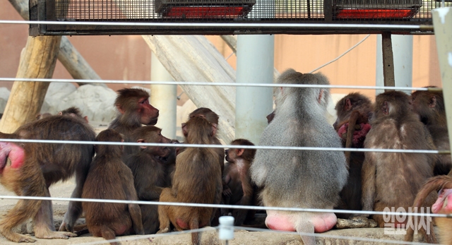 27일 경기도 과천 서울동물원에서 망토원숭이 무리들이 점점 추워지는 날씨를 피해 온열기 아래서 몸을 녹이고 있다.
