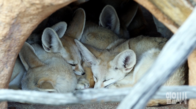 27일 경기도 과천 서울동물원에 사는 사막여우 무리들이 점점 추워지는 날씨를 피해 동굴에 모여 몸을 녹이고 있다.