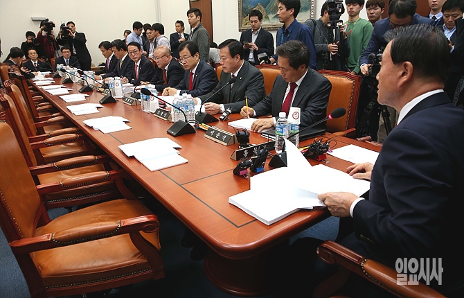 새정치민주연합이 새누리당의 누리과정 예산 심사 파행을 이유로 모든 상임위 법안심사를 잠정 보류한 지 이틀째인 27일 오후 서울 여의도 국회에서 새누리당 단독으로 예산결산특별위원회 7차 예산안등조정소위원회가 열리고 있는 가운데, 야당 박완주·황주홍·이춘석·민병두 등 소위 위원들의 자리는 명패만 덩그러니 놓여져 있다.