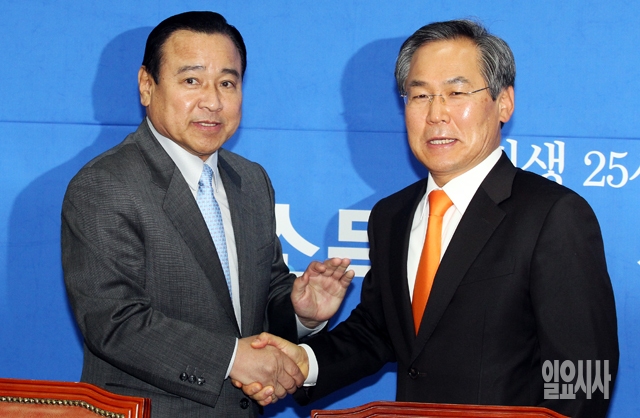 28일 서울 여의도 국회 새정치민주연합 원내대표실에서 새누리당 이완구 원내대표(왼쪽)와 새정치민주연합 우윤근 원내대표가 회동에 앞서 악수를 하고 있다.