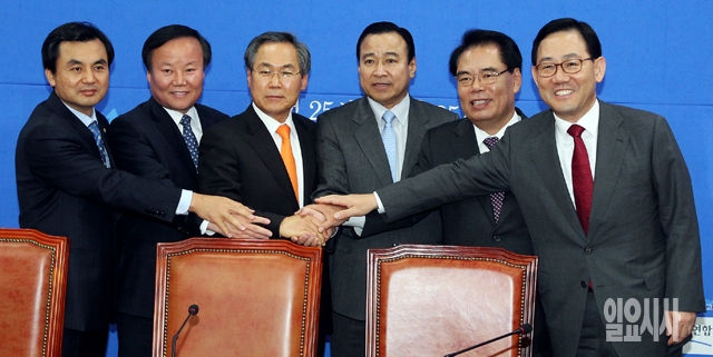28일 서울 여의도 국회 새정치민주연합 원내대표실에서 새누리당 이완구 원내대표와 새정치민주연합 우윤근 원내대표를 비롯한 원내지도부들이 회동에 앞서 손을 모으고 있다. 왼쪽부터 새정치민주연합 안규백 원내수석부대표, 새누리당 김재원 원내수석부대표, 새정치민주연합 우윤근 원내대표, 새누리당 이완구 원내대표, 새정치민주연합 백재현 정책위의장, 새누리당 주호영 정책위의장.
