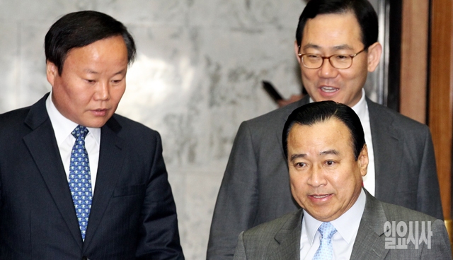 28일 서울 여의도 국회에서 열린 새누리당 상임위원장-간사단 연석회의에서 이완구 원내대표, 주호영 정책위의장, 김재원 원내수석부대표가 참석하고 있다.