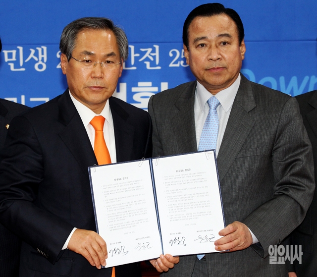 새누리당 이완구(오른쪽), 새정치민주연합 우윤근 원내대표가 28일 서울 여의도 국회 새정치민주연합 원내대표실에서 원내대표 합의문에 서명을 한 뒤 들어보이고 있다.