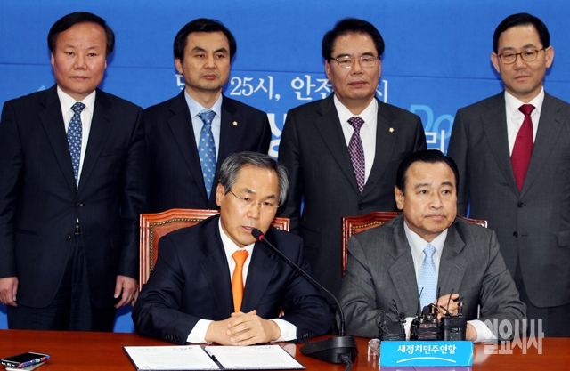 새정치민주연합 우윤근 원내대표(왼쪽)가 28일 서울 여의도 국회 새정치민주연합 원내대표실에서 원내대표 합의문에 서명을 한 뒤 발언을 하고 있다.