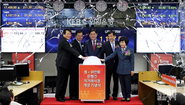 최경환 경제부총리 겸 기획재정부 장관을 비롯한 내빈들이 1일 서울 중구 외환은행 본점 딜링룸에서 열린 '원·위안화 은행간 직거래시장 개장 기념식'에서 개장 세레모니를 하고 있다. 왼쪽부터 김한조 외환은행장, 주장정 중국대사관 경제공사, 최 부총리, 이주열 한국은행 총재, 권선주 IBK외환은행장.
