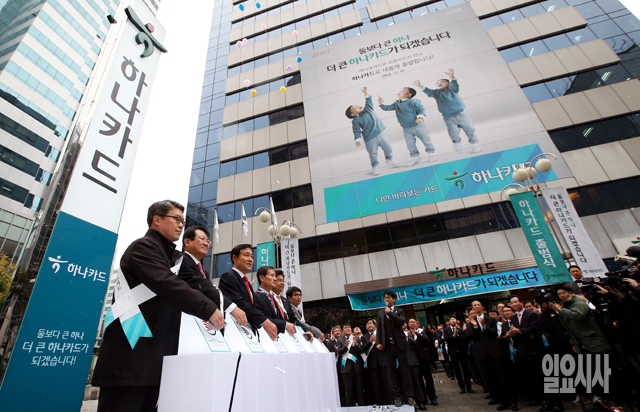 1일 서울 중구 다동 하나카드 본사에서 열린 통합 하나카드 출범식에서 김정태 하나금융그룹 회장과 정해붕 하나카드 사장 등 참석자들이 출범 축하 세리머니를 하고 있다.
