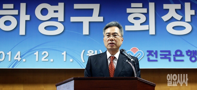 하영구 신임 전국은행연합회장이 1일 서울 중구 명동 은행회관에서 열린 취임식에서 취임사를 하고 있다.