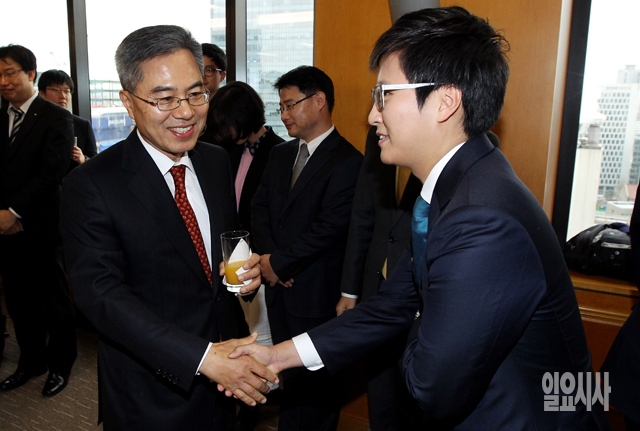 하영구 신임 전국은행연합회장(왼쪽)이 1일 서울 중구 명동 은행회관에서 열린 취임식에서 직원들과 인사를 나누고 있다.