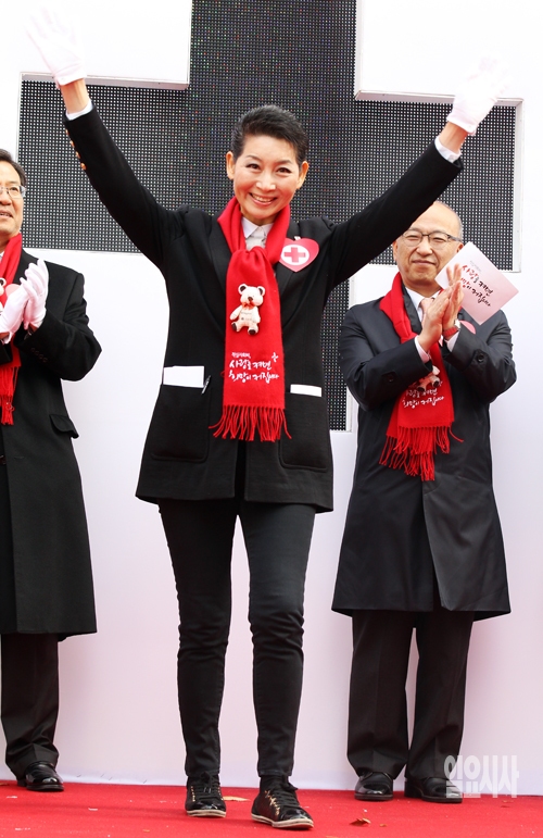 1일 서울 중구 명동에서 열린 적십자회비 모금 선포식에서 김성주 대한적십자사 총재가 손을 들어 인사하고 있다.