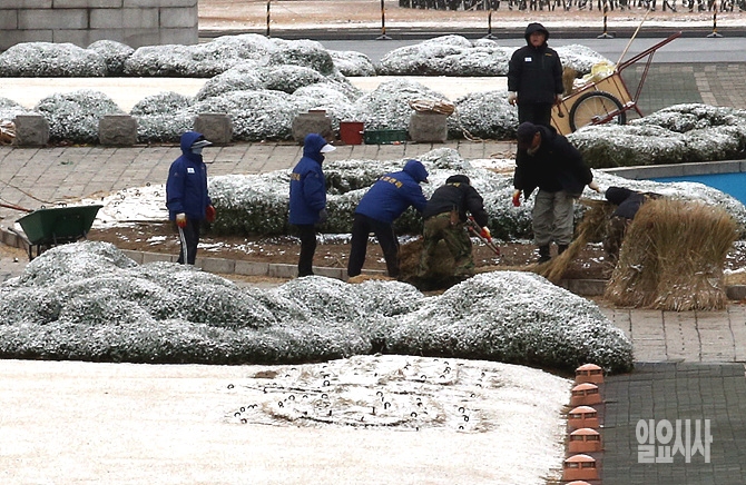 1일 오전, 기습 첫눈이 내린 기운데 서울 여의도 국회 관계자들이 폭설대비 작업을 하고 있다.